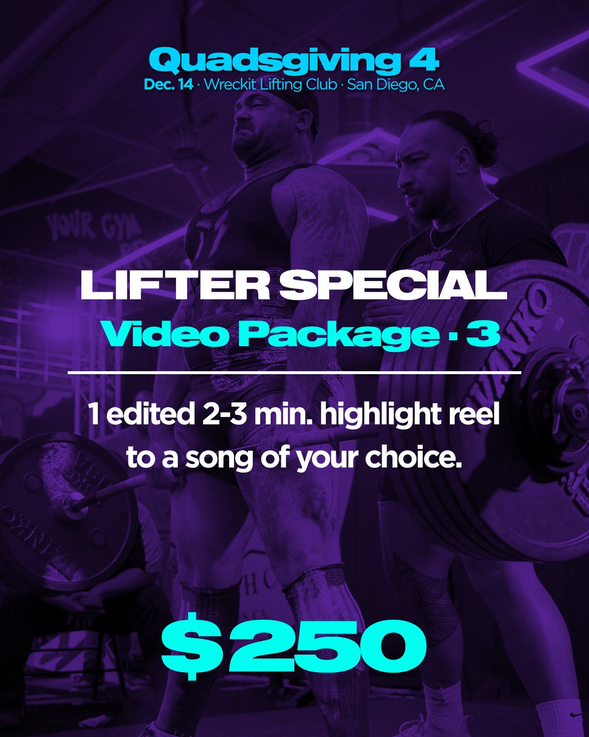 Examples of powerlifting meet video work can be seen on the Bueno Creative instagram: https://www.instagram.com/bueno.creative/